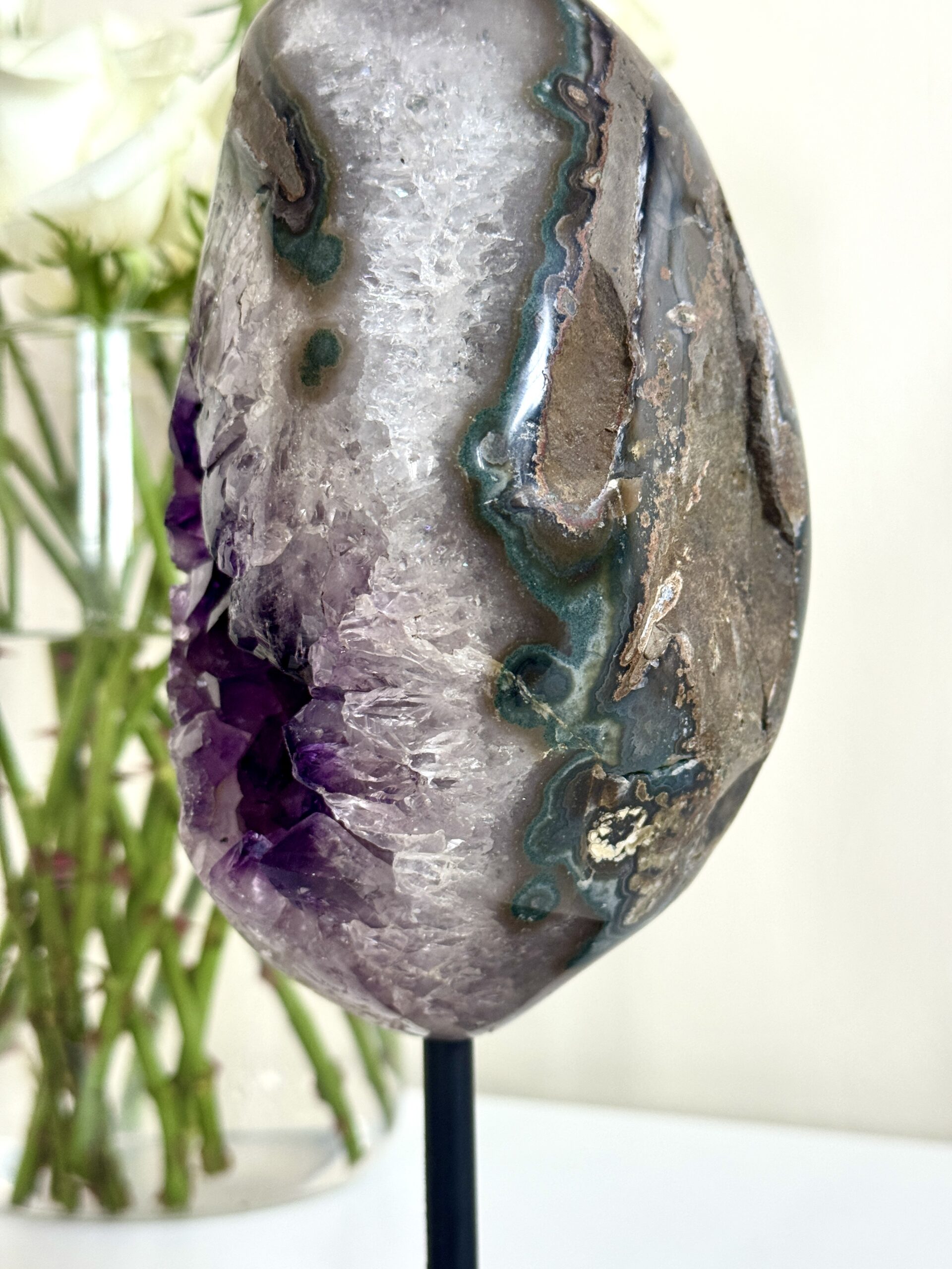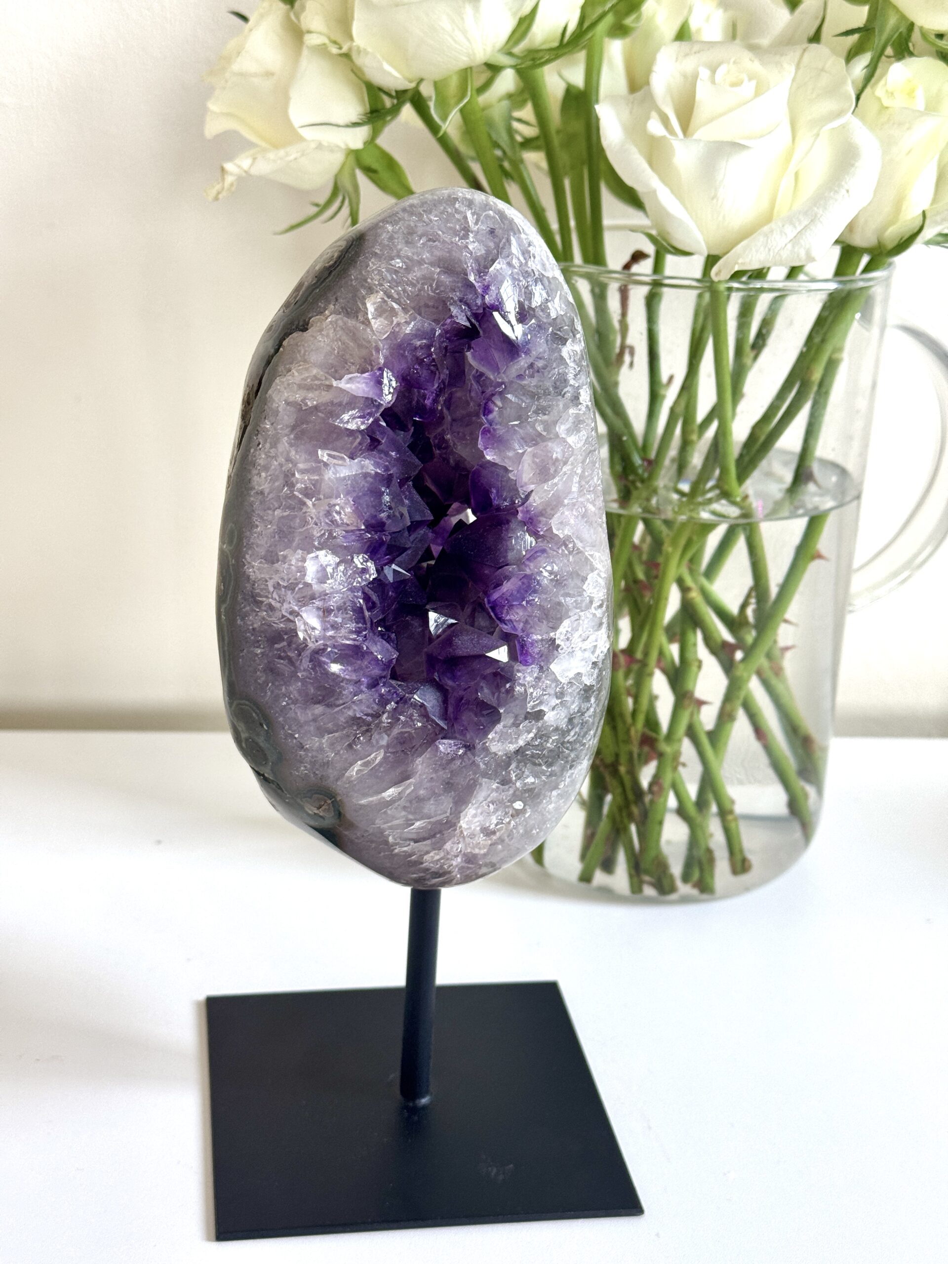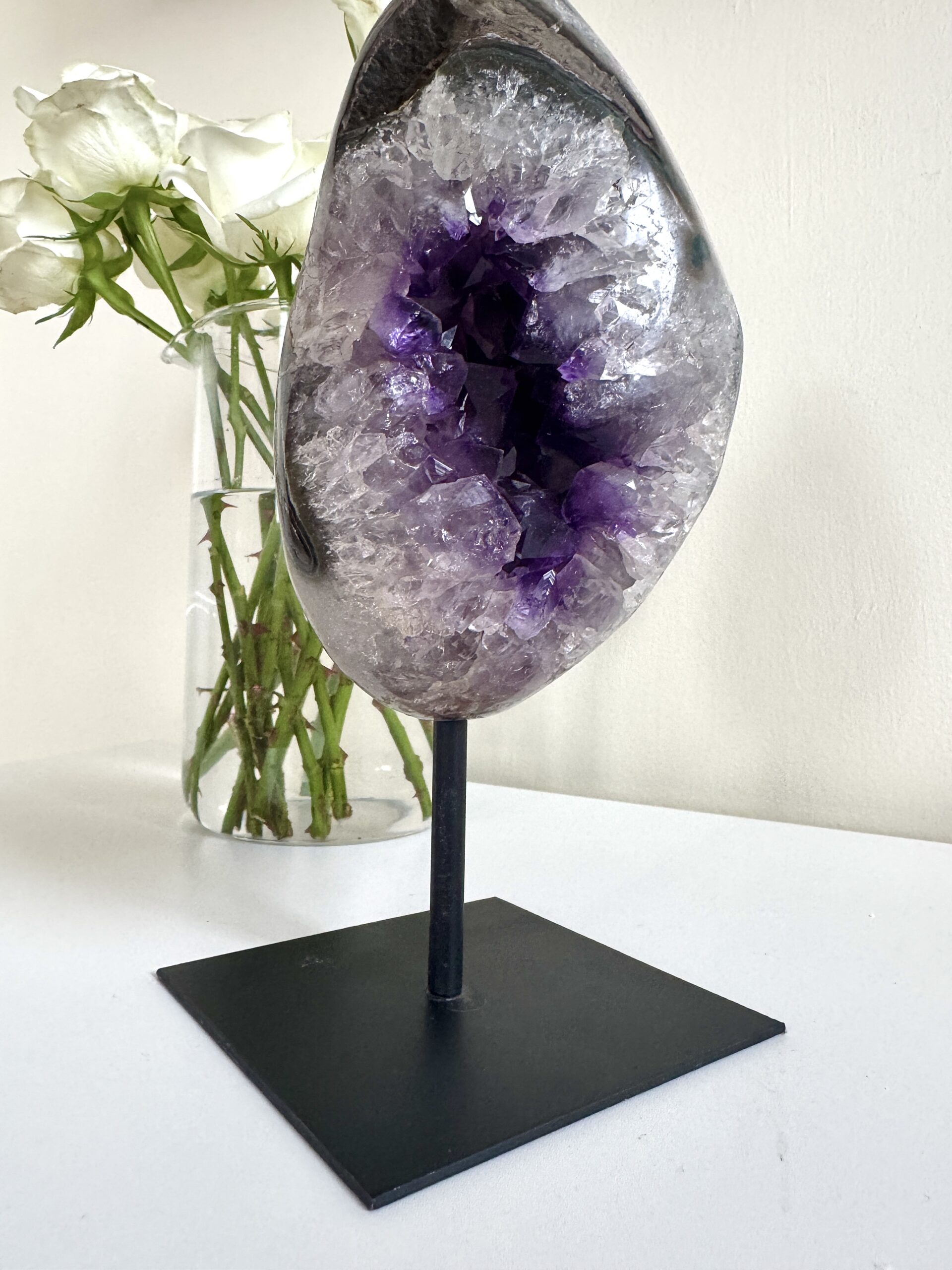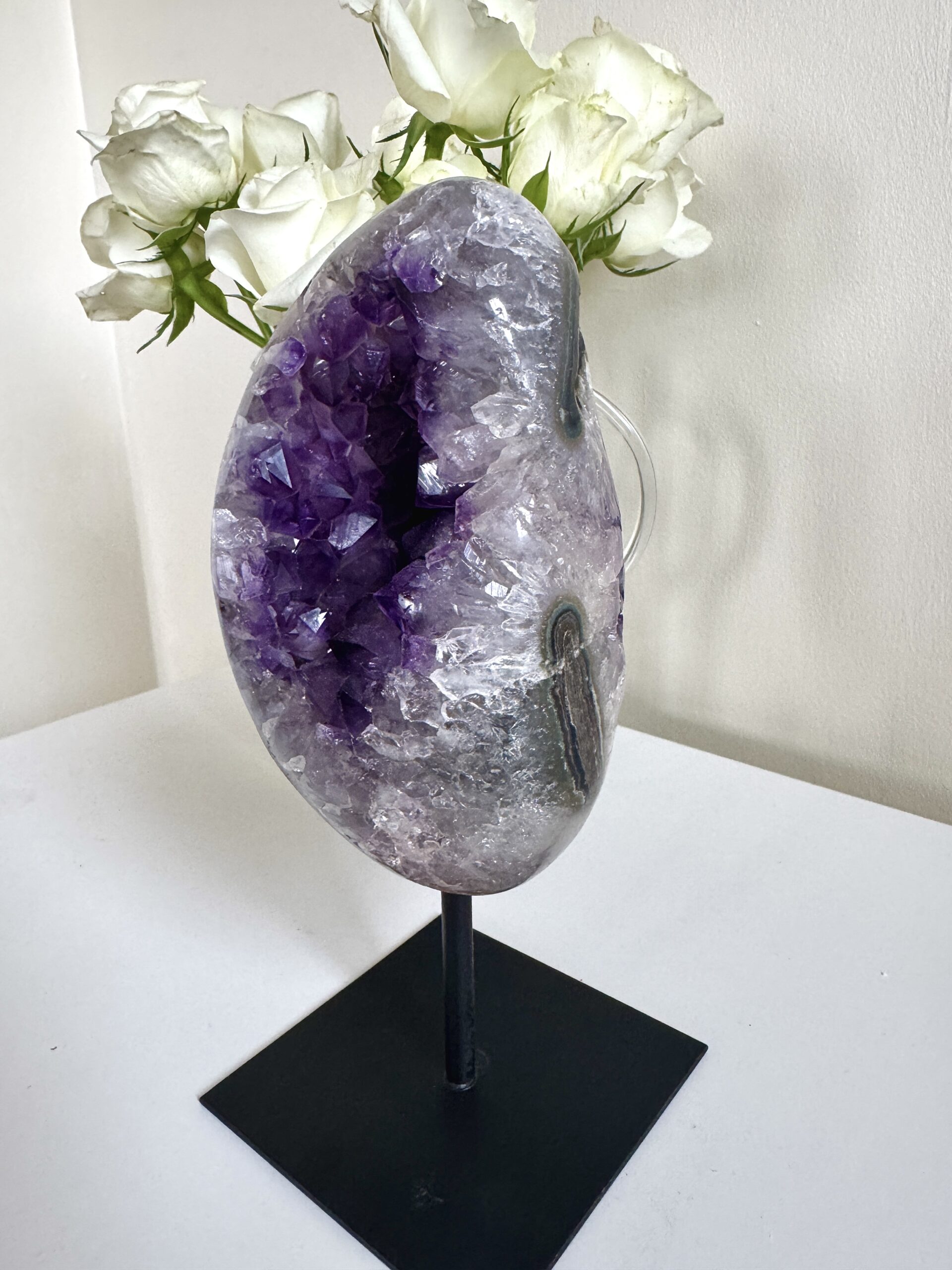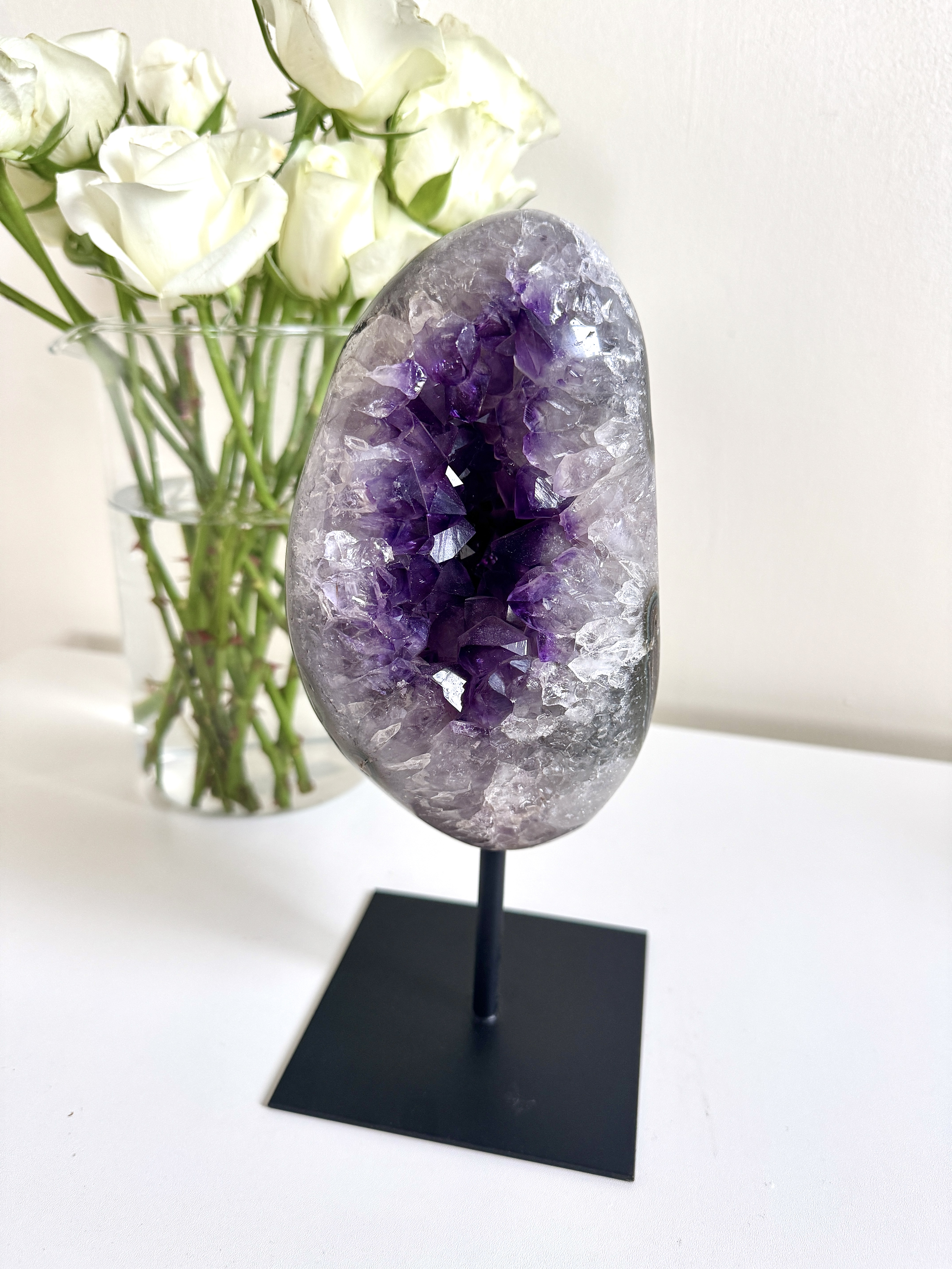 The mini portal adds an extra element of uniqueness to this piece, making it a true conversation starter. Add this beautiful amethyst druzy with mini portal on stand to your collection today!
