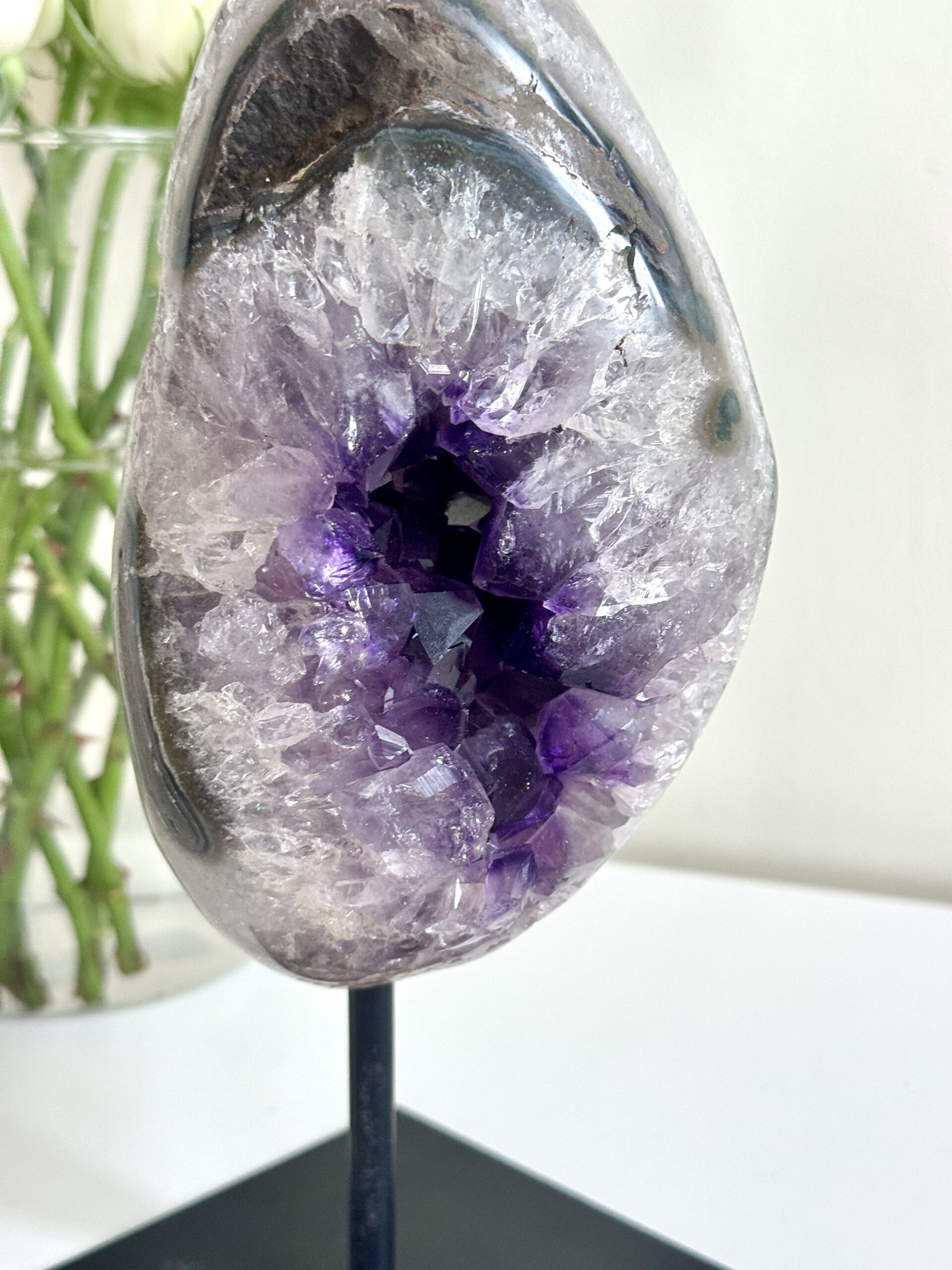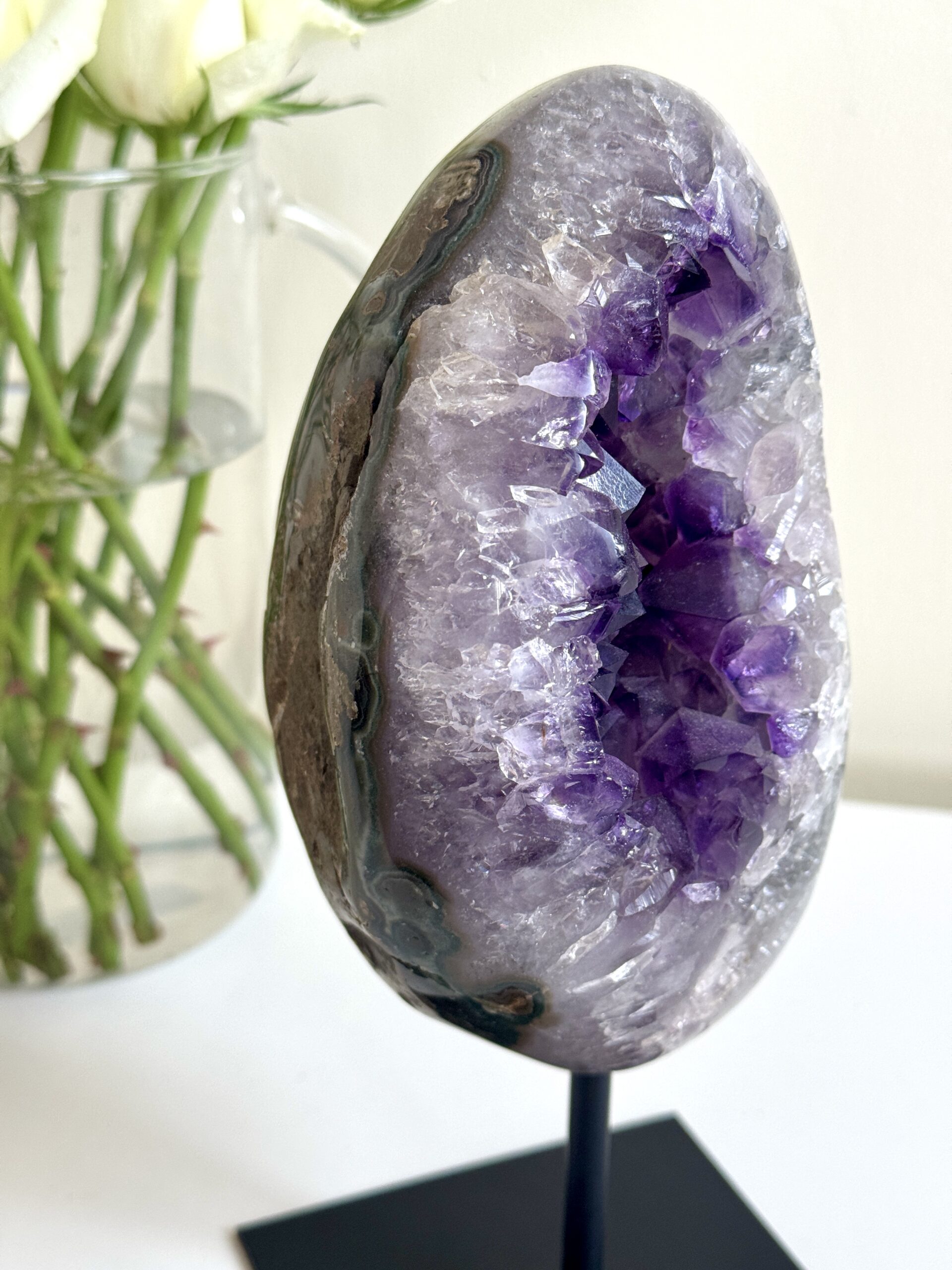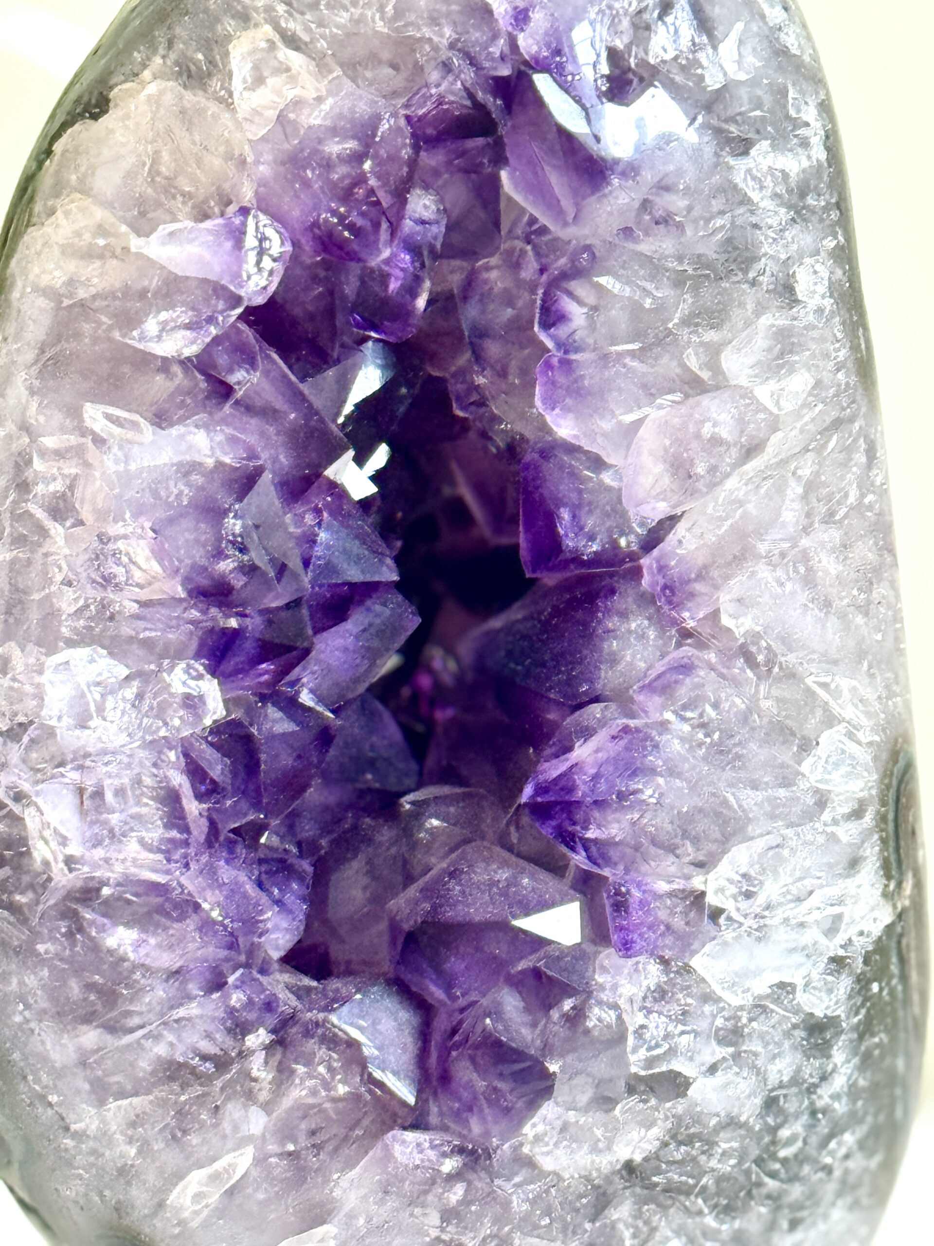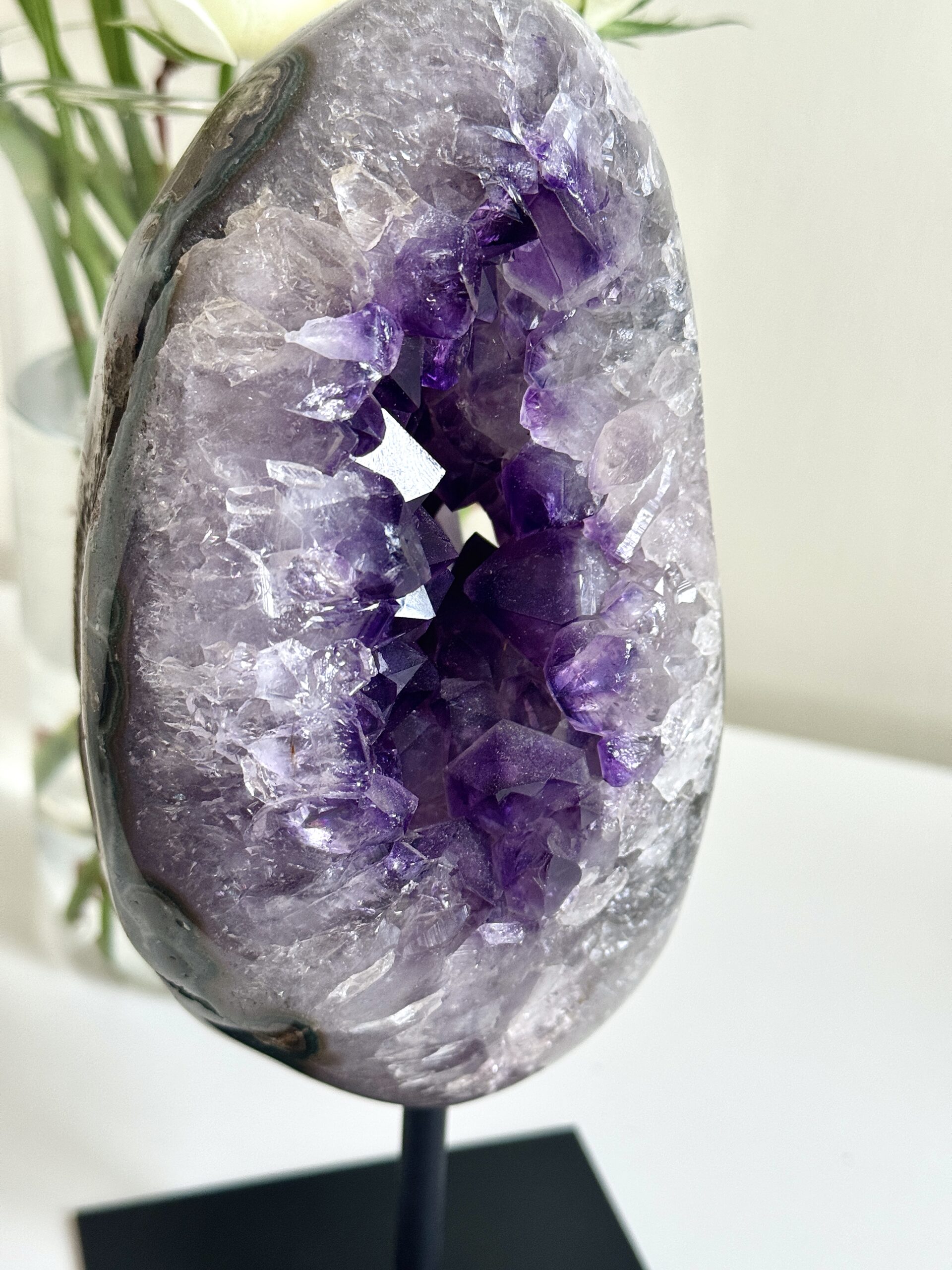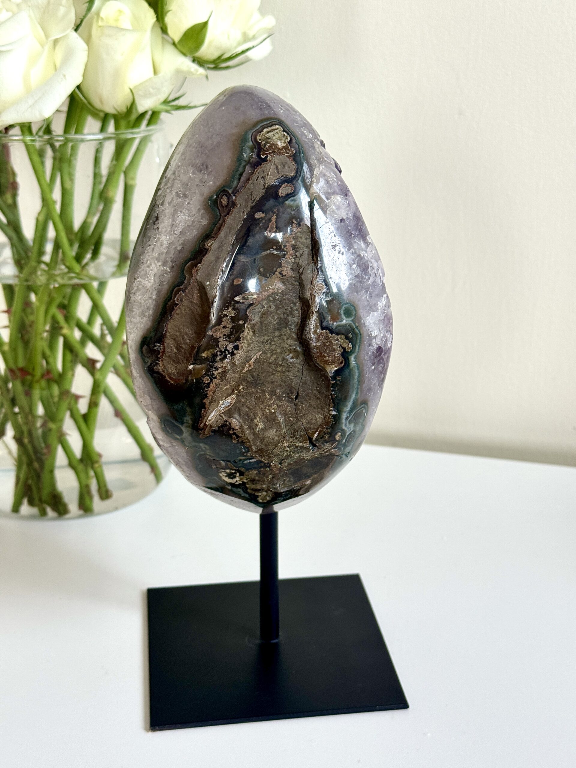 The mini portal adds an extra element of uniqueness to this piece, making it a true conversation starter. Add this beautiful amethyst druzy with mini portal on stand to your collection today!